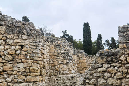 antique ruins - the remains of stone walls against the background of a cypress grove