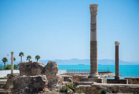 Archaeological excavations. A view of the ancient marble columns in Carthage and the Mediterranean. Tunisia.