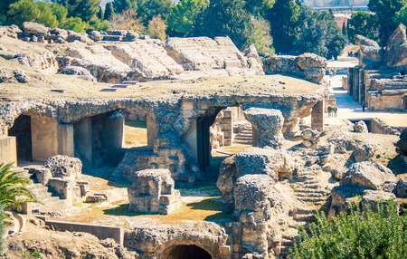 Panoramic view of the ancient greek theater of syracuse, a historical landmark and popular tourist destination in sicily, italy, on a sunny day with blue sky