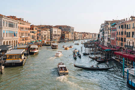 Venice, Italy - May 21, 2022: Boats, gondolas and water taxis navigating through Grand Canal and the buildings from Rialto bridge in Venice, capital of Veneto region and a famous travel destination.