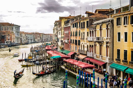Grand channel in Venice, Italy. Beautiful shot of the buildings on the water. Cloudy weather. Many boats and gondols. Parking places for the boats. Perspective of the city.