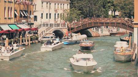 VENICE ITALY - OCTOBER 2019. View of Canal Grande with variety of boats and ships on the water with passengers. Excursions and sightseeing of the ancient city.Warm autumn day on a trip to Europe.