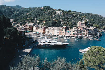 Stunning view in Portofino in Italy with some villas and boats - Travel destination in italy.