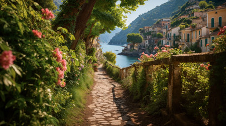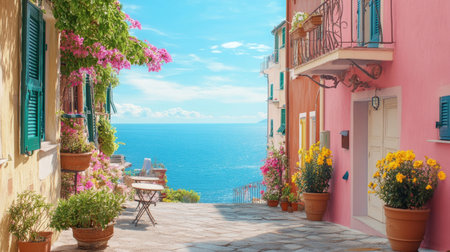 Explore a tranquil coastal street adorned with vibrant flowers and a breathtaking ocean view. This picturesque scene captures the essence of summer relaxation.