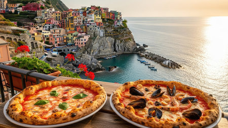 Two pizzas are presented on a wooden surface, with a picturesque coastal town in the background. The scene features a bright, natural light illuminating the food and the environment. This composition is suitable for various commercial purposes, including culinary advertising and travel-related content.