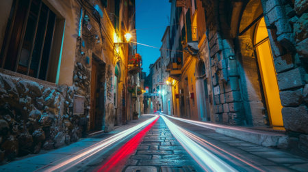 A glimpse down a narrow street lined with ancient architecture and adorned with colorful car light trails