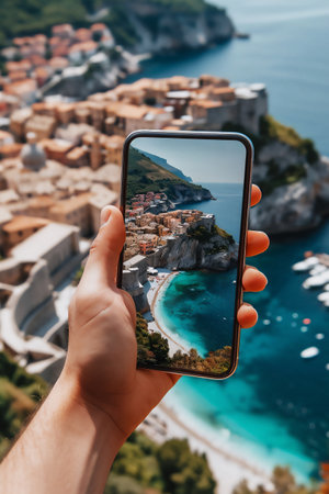 Traveller taking pictures of beautiful scenery with a mobile phone in one hand. Travelling and vacation concept. Generative AI.