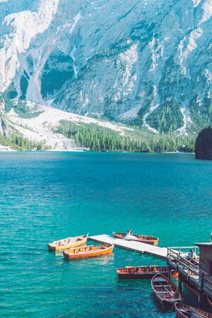 view of wooden house on water with pier and boats lake in dolomites mountains. hiking place