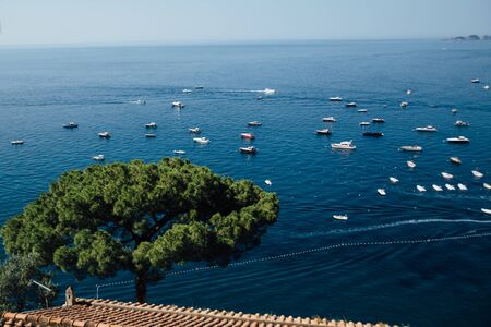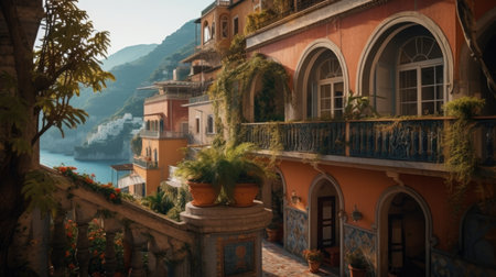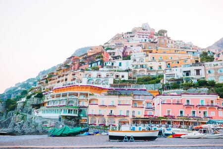 The coast of Positano, Amalfi in Italy. Panorama of the evening city and the streets with shops and cafes. Houses by the sea and the beach. Ancient architecture and temples. View from a postcard on top
