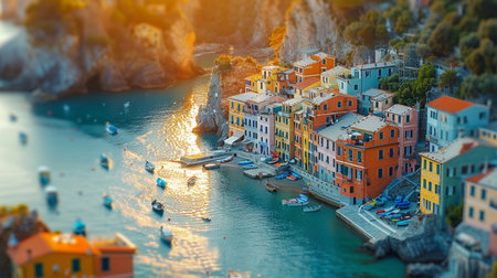 Sunset view of Manarola, Cinque Terre, with the colorful houses glowing in warm hues, set against the dramatic cliffs and sea. No people included.