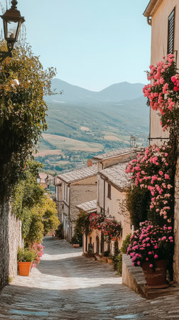 Wander through Spello's picturesque streets lined with vibrant flowers and medieval architecture, all framed by the majestic Umbrian mountains.