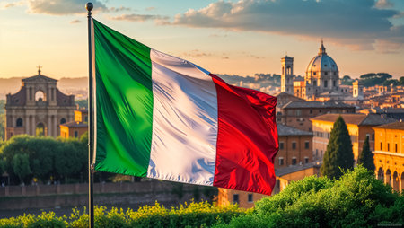 Italian flag fluttering in the wind against the backdrop of stunning Rome, sunny day