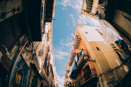 Street view in Palermo. Traditional old houses against blue sunny sky.