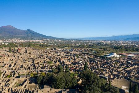 The magnificent ruins of Pompeii, Italy, with Mount Vesuvius looming in the background.
