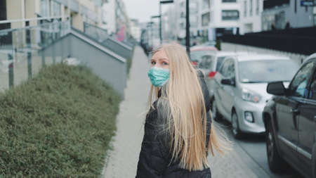 Young blonde woman in a medical mask escaping from somebody on the street. She is scared and concerned. Coronavirus pandemic concept.