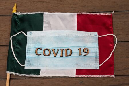 Face mask with the word Covid-19 made from wooden letters and Mexican or Italian flag on wooden background