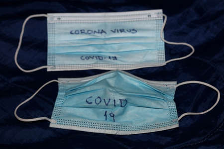 Typical white 3-ply surgical mask with rubber earhooks to cover mouth and nose with English block letters Covid-19 on a blue background. Dangerous virus and quarantine concept