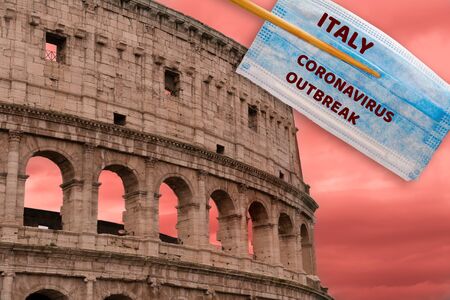 Rome Italy Coronavirus COVID-19 world outbreak concept. Chopsticks holding a blooded protective face mask before The Colosseum Flavian Amphitheatre to illustrate 2019-nCoV virus worldwide spread