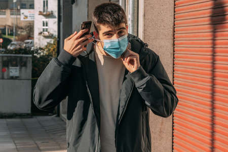 Young man having video call with her mother standing outdoors in the street in the evening wearing the face mask to avoid virus infection and to prevent the spread of disease in time of coronavirus