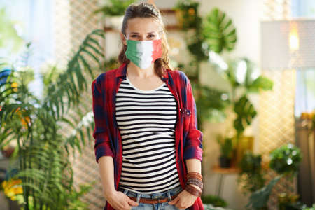 Travel during pandemic. Portrait of middle aged traveller woman with italian flag medical mask, backpack, sanitiser and headphones in the modern house in sunny day.