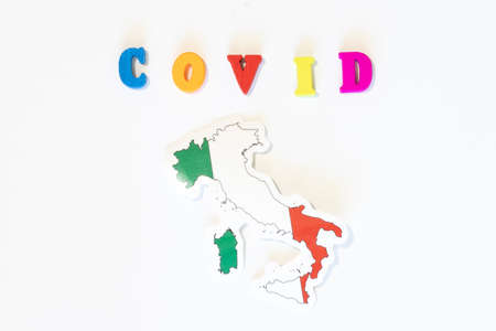 Italy national flag on a white background with the inscription Covid made with letter board. Coronavirus is a pandemic virus