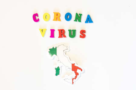 Italy national flag on a white background with the inscription Corona virus made with letter board. Coronavirus is a pandemic virus