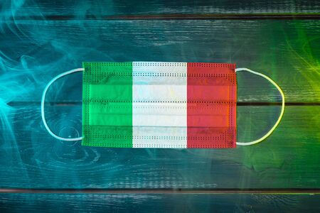 Medical mask for protection against airborne diseases, painted in the national flag of Italy on a black background in blue-green smoke. Medical protection against airborne diseases, coronavirus