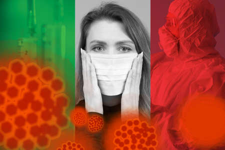 Italy. Panic due to epidemic in Italy. Concept - girl is afraid of infection. Figure virus next to the flag of Italy. Epidemiology in Italy. Panic due to virus. Concept - doctors found an antidote