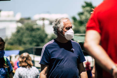 Limassol Cyprus May 09, 2020 View of an unidentified people with a face mask to protect themselves from the coronavirus shopping in the Limassol market in the morning