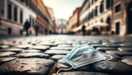 Close-up of a face mask lying on a cobblestone street, blurred cityscape and people walking