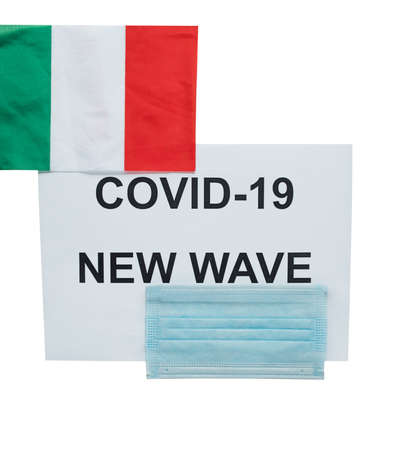 Sheet with inscription: new wave, medical mask and flag of Italy. Isolated on a white background. Concept of the next wave of infections in Italy