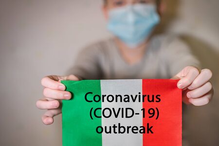 Text Coronavirus COVID-19 on italian flag. Outbreak Novel Coronavirus outbreak concept. Coronavirus protective breathing mask and glasses. 2019 nCoV virus infection originating