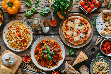 A vibrant and appetizing spread of Italian dishes including spaghetti, pizza, fresh vegetables, and various cheeses, all beautifully arranged on a rustic wooden table.