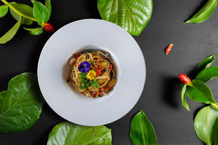 Black spaghetti : Black seafood pasta with clams, garlic, chili, and basil on the white plate.