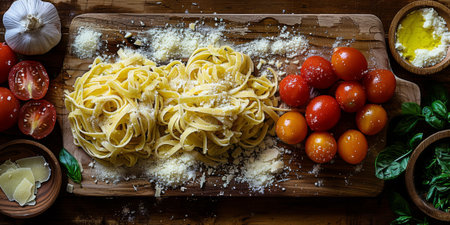 A mouthwatering top view of a plate of fresh pasta garnished with cherry tomatoes, basil, and a sprinkle of parmesan, surrounded by the raw ingredients that inspired the dish, captured on a wooden table.