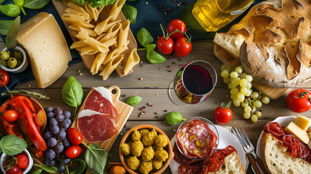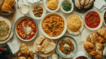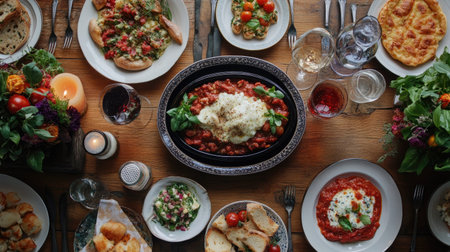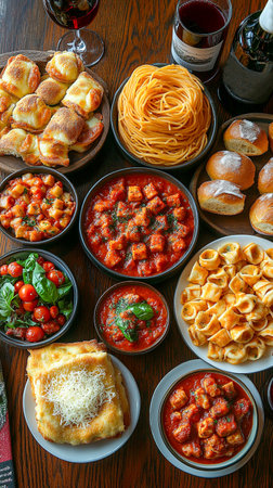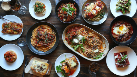 Experience a delightful aerial view showcasing an exquisite spread of Italian dishes. The colorful presentation invites sharing and savoring together.
