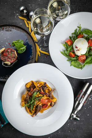 set of dishes for the restaurant menu on a light background. European cuisine, Top view