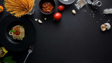 Top view of ingredients of delicious classic Italian spaghetti pasta with tomato sauce, and copy space on black background