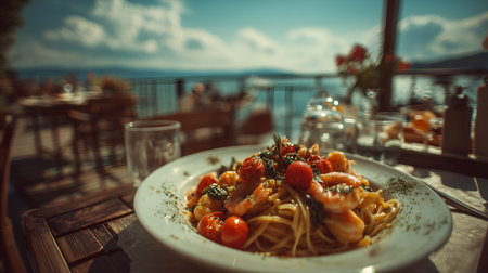 Delicious Spaghetti ai Frutti di Mare with shrimp, cherry tomatoes, and herbs served on a sunny Mediterranean seaside terrace. Perfect for illustrating Italian coastal cuisine, al fresco dining, and gourmet seafood pasta dishes in stunning seaside settings.