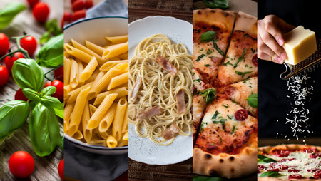 Vibrant tomatoes, fresh basil, and various pasta types are beautifully arranged alongside delectable pasta dishes, showing the art of Italian cuisine and the joy of cooking with fresh ingredients