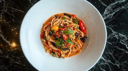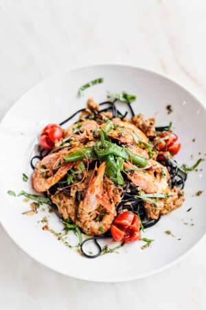 gourmet grilled prawn and vegetables on black squid ink pasta