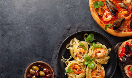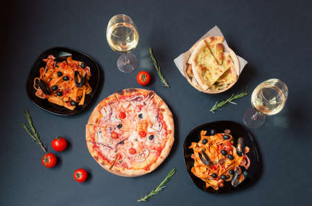 Seafood pizza, plates of pappardelle pasta with seafood with tomato sauce, glasses of white wine and focaccia bread on dark background. Top view.