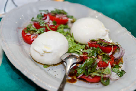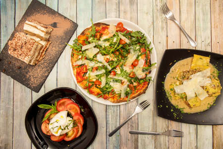 Set of Italian dishes with Neapolitan pizza with a lot of arugula, burrata salad with tomato and olive oil, ravioli with cheese and sauce and tiramisu for dessert