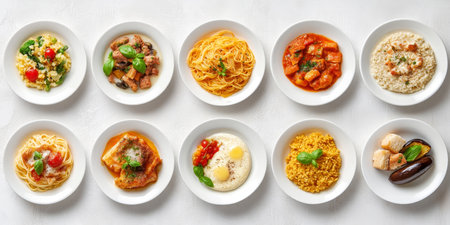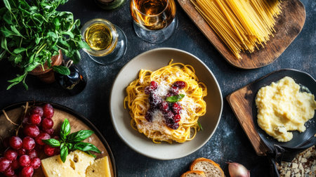 An aerial shot of a delicious Italian food set, featuring pasta, carbonara, and polenta, beautifully presented with garnishes, emphasizing the diversity and richness of Italy's culinary offerings.