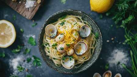Capture the essence of gourmet dining with this aerial view of a spaghetti dish topped with clams, herbs, and lemon, perfect for culinary inspiration.