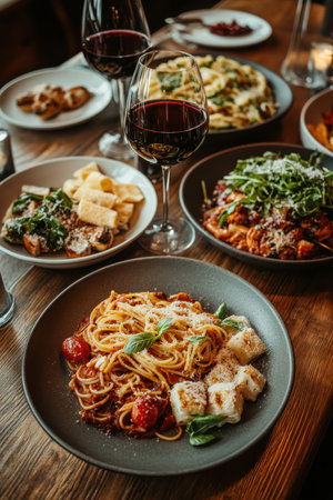 Experience a rich Italian dining experience with an array of pasta dishes, sauces, fresh vegetables, and warm bread presented beautifully on a rustic table.