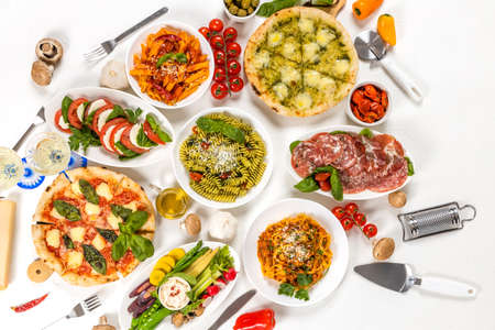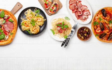 Italian food. Pasta, pizza, olives and antipasto toasts. Flat lay with copy space