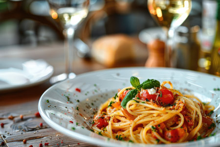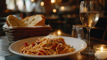 A delectable plate of spaghetti adorned with herbs and cheese, paired with garlic bread and a glass of wine, creates a warm and inviting dining experience.