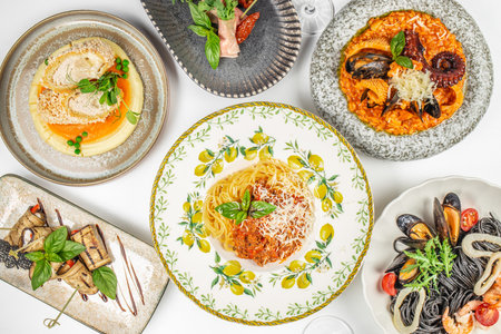 Top view of assorted Italian gourmet dishes including spaghetti with tomato sauce, seafood risotto, black pasta with shrimp and mussels, eggplant rolls, and breaded chicken cutlet.
