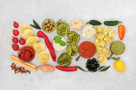 Italian food for a healthy balanced diet with a selection of health foods high in antioxidants, anthocyanins, lycopene, protein, vitamins, fiber, omega 3, & minerals. Flat lay on mottled grey.